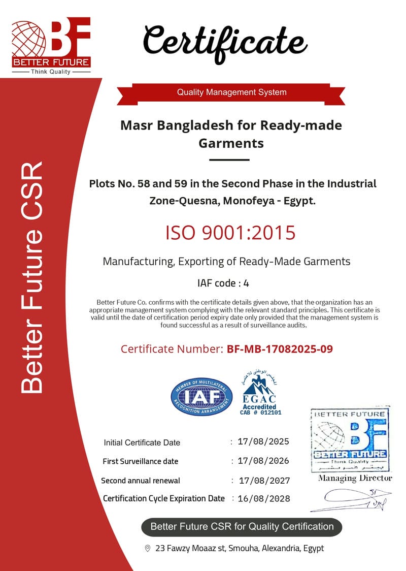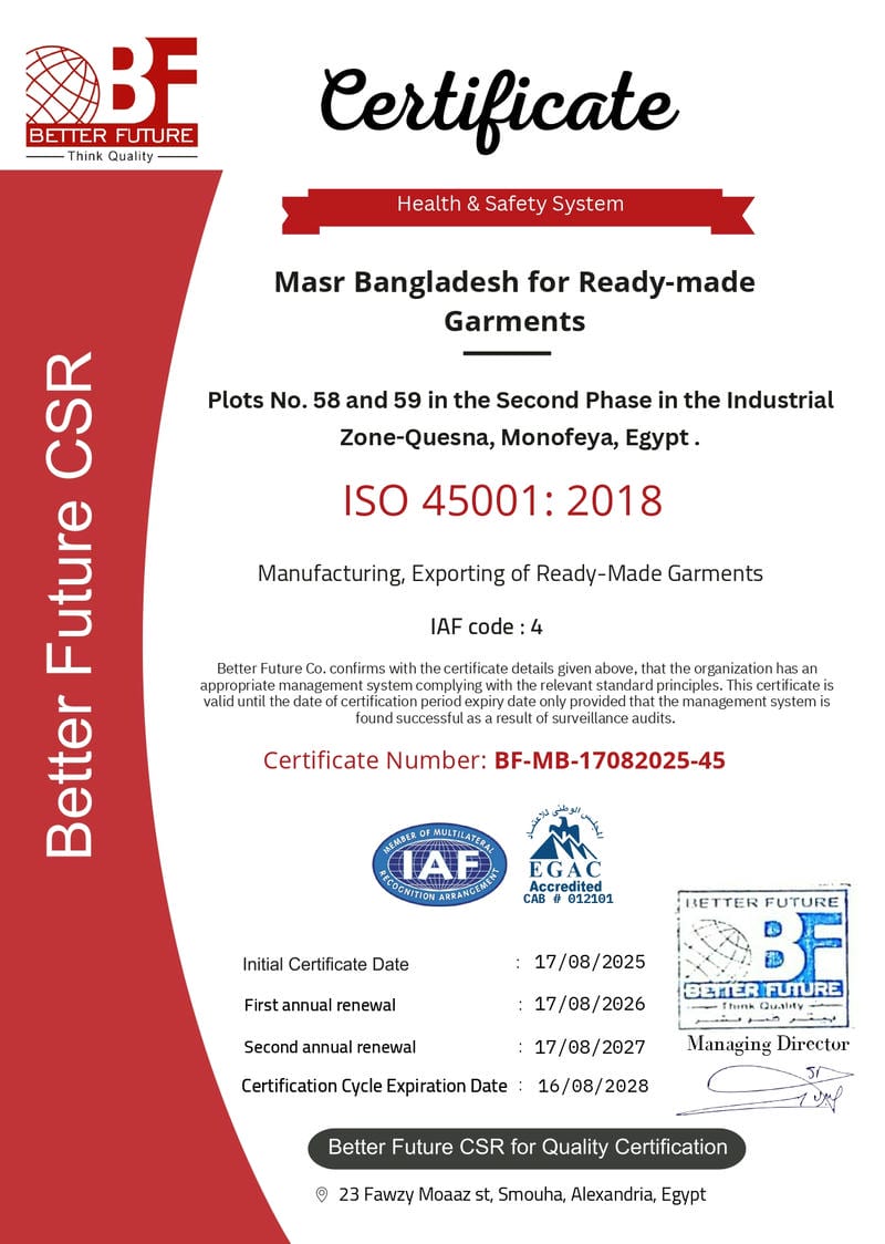 MASR Bangladesh Co. is committed to meeting international standards. Our certifications reflect our dedication to quality, safety, and reliability in every garment we produce.